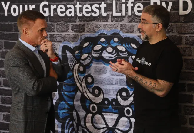 Kevin Harrington, the original Shark on the hit TV show Shark Tank, talking with Mike Agugliaro at a recent FuDog Group training event.